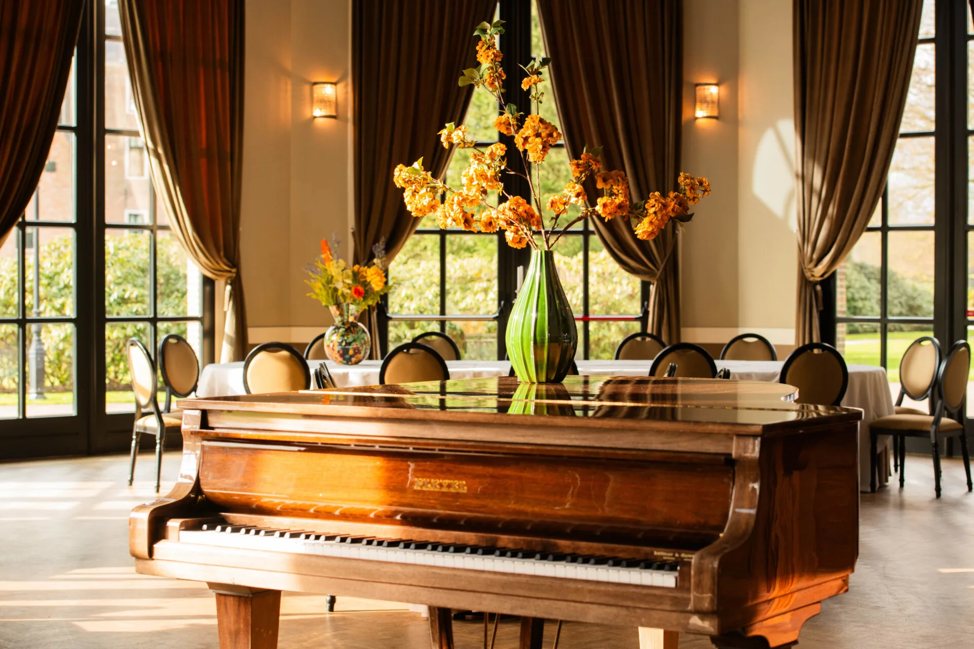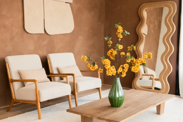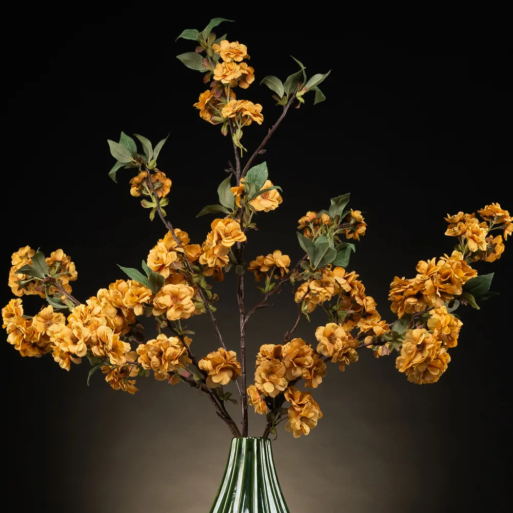 Bloemstuk Colette straalt natuurlijke verfijning uit. De warme goudgele bloemen contrasteren prachtig met het groen van de bladeren en de glanzende vaas. De eenvoudige, maar sierlijke vormgeving geeft het arrangement een tijdloze en rustgevende uitstraling. Een stijlvol accent voor ieder interieur, zonder onderhoud, maar met blijvende schoonheid.