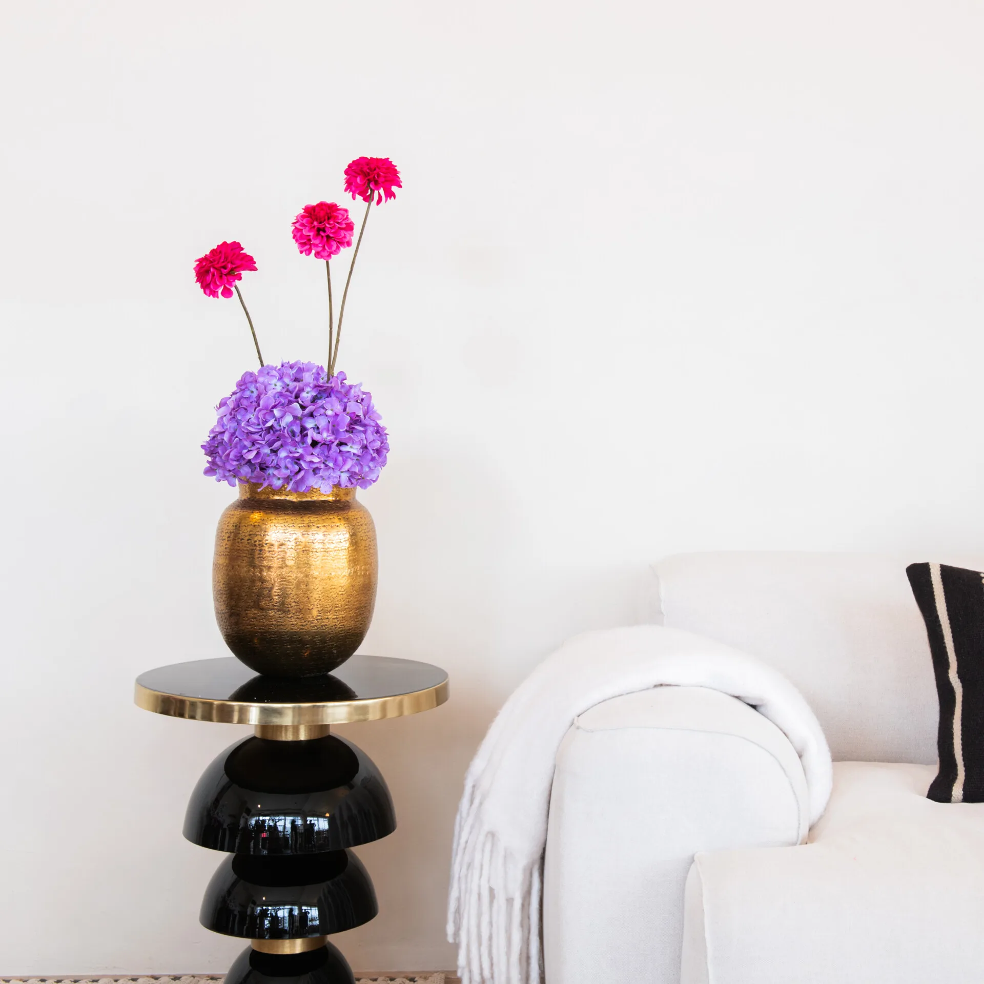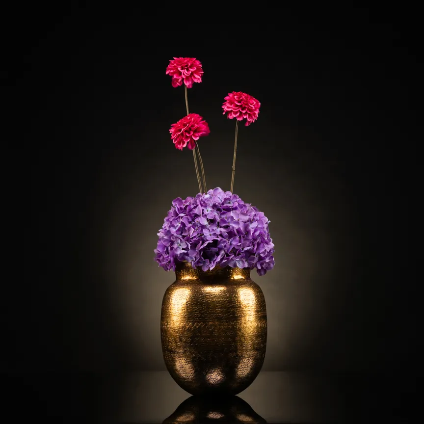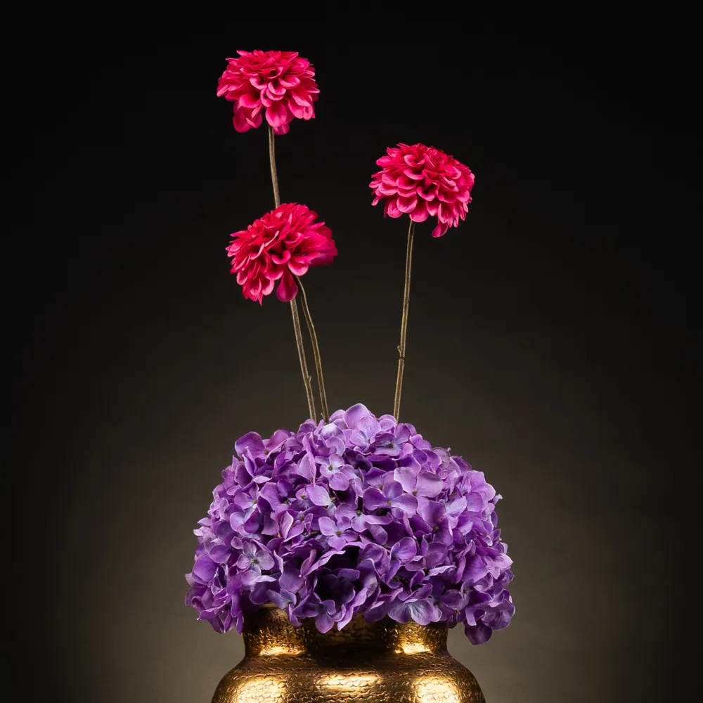 Bloemstuk Amélie straalt elegantie en luxe uit. Diep paarse hortensia’s zijn een mooie combinatie met de roze dahlia’s die met sierlijke stelen een speelse touch toevoegen. Geplaatst in een gouden vaas combineert dit bloemstuk klassieke schoonheid met moderne finesse en is het een stijlvolle blikvanger voor elk interieur.