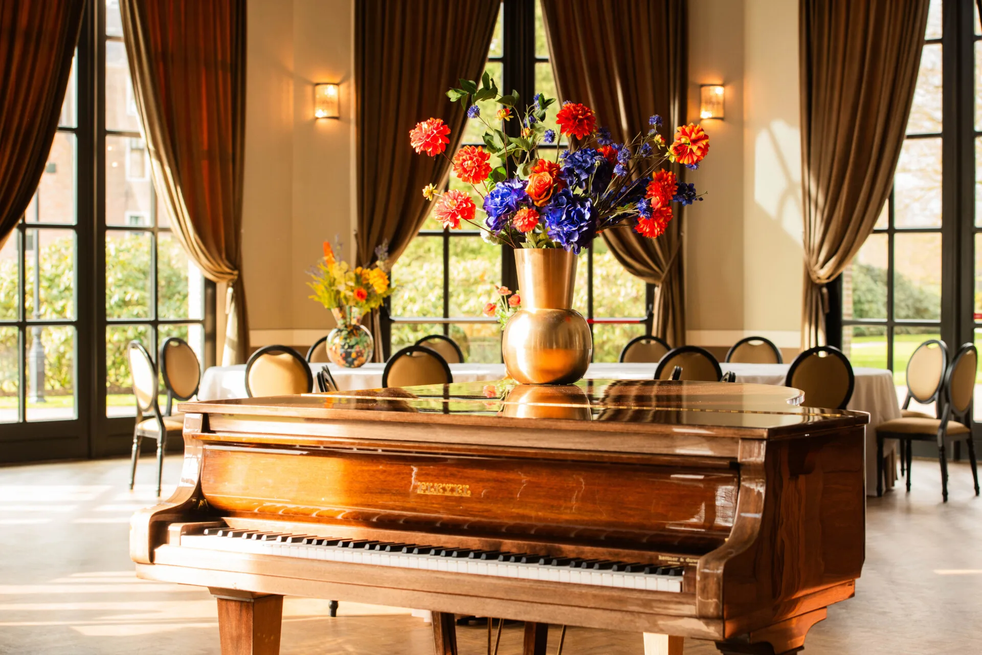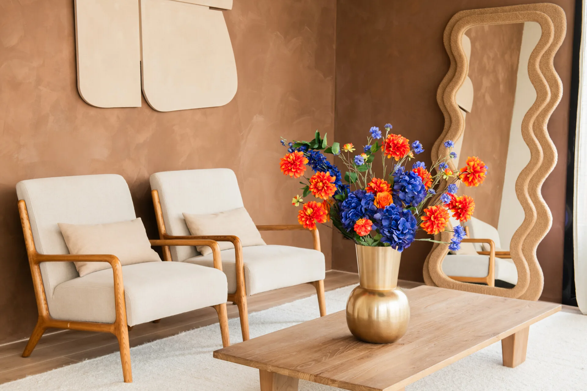 Bloemstuk Amy is een gedurfde en verfijnde compositie die luxe en levendigheid combineert. De warme gouden vaas vormt een perfect contrast met de rijke oranje en diepe blauwe bloemen, terwijl de weelderige groene bladeren het geheel in balans brengen. Dit arrangement straalt warmte en elegantie uit en voegt een artistiek statement toe aan elke ruimte. Amy is een tijdloze blikvanger die blijft schitteren, zonder onderhoud. Perfect voor wie durft op te vallen!