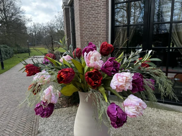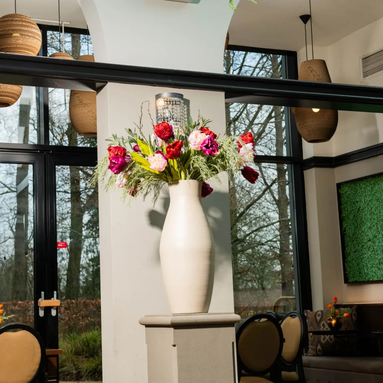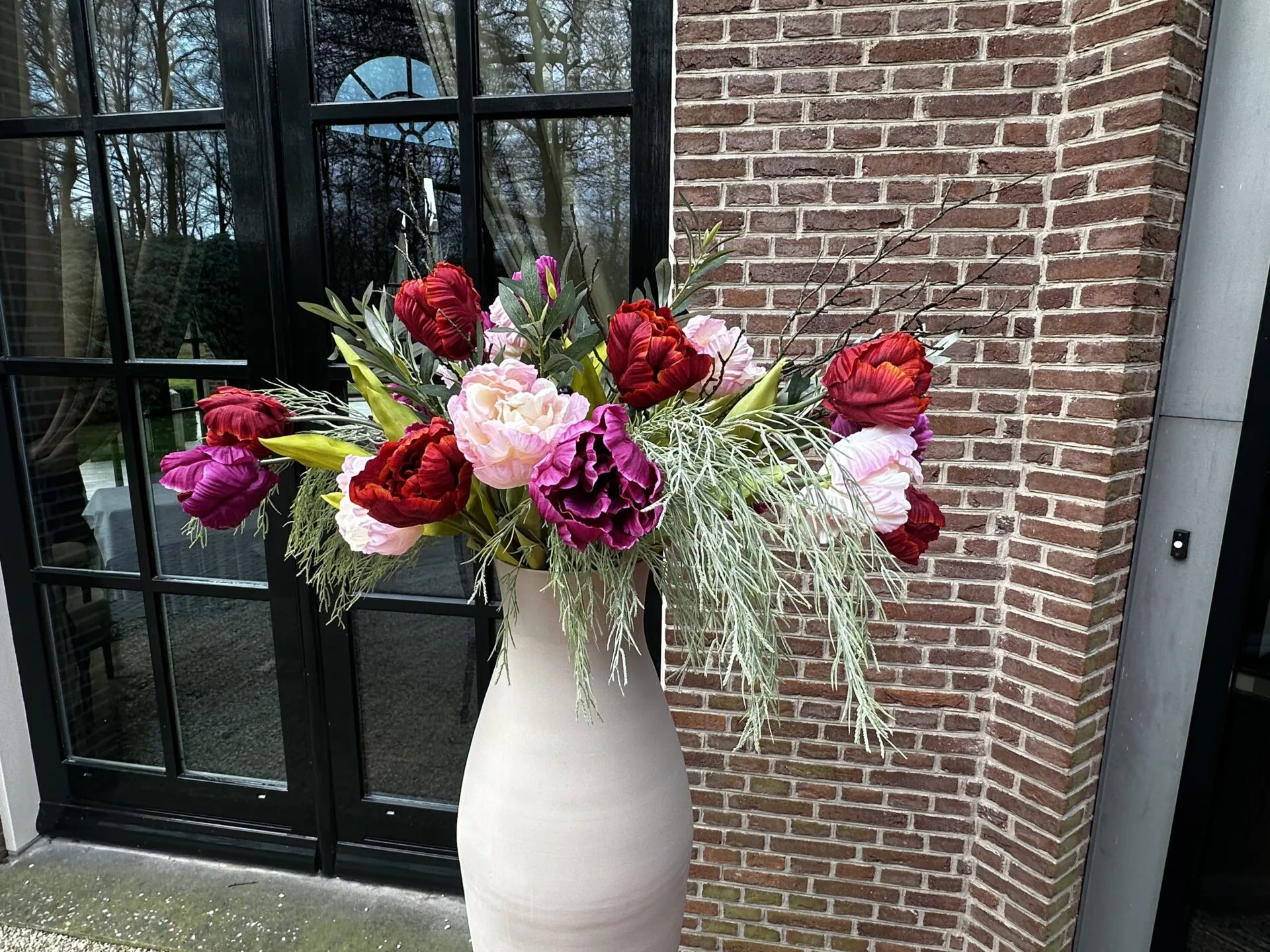 Bloemstuk Didi is een speelse en kleurrijke blikvanger die direct warmte en sfeer brengt. De hoge, elegante vaas vormt een stijlvol contrast met de weelderige bloemen in rijke rood-, roze- en paarstinten. Dit arrangement straalt energie uit en geeft elke ruimte een levendige uitstraling. Perfect voor een uitnodigende entree in een hotel, restaurant of bedrijfspand, maar ook een prachtige toevoeging aan een ruim huis of stijlvolle ontvangstruimte.