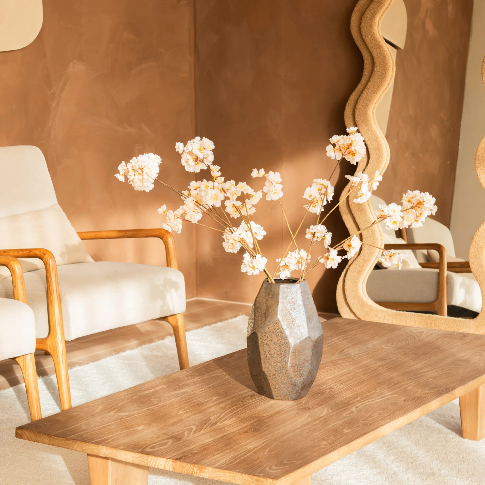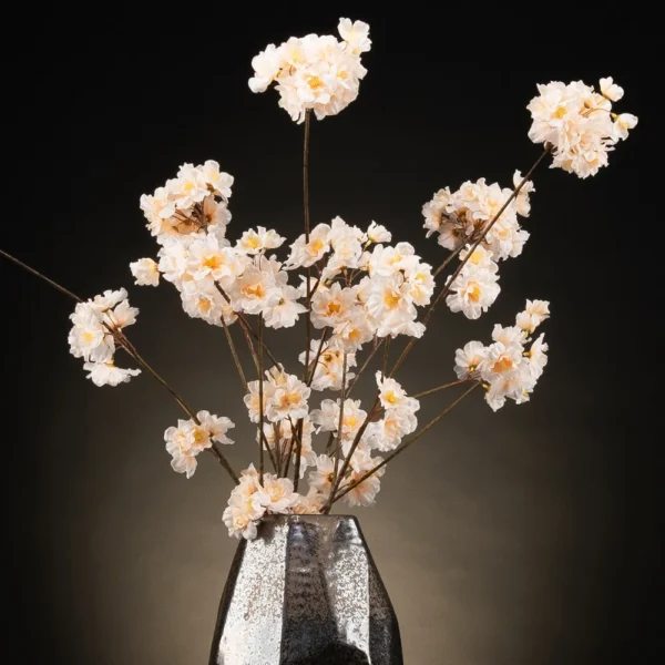 Bloemstuk Elle straalt eenvoud en elegantie uit. De speelse bloesemtakken vormen een prachtig contrast met de geometrische vaas. Een tijdloos arrangement dat rust en verfijning brengt in elke ruimte.
