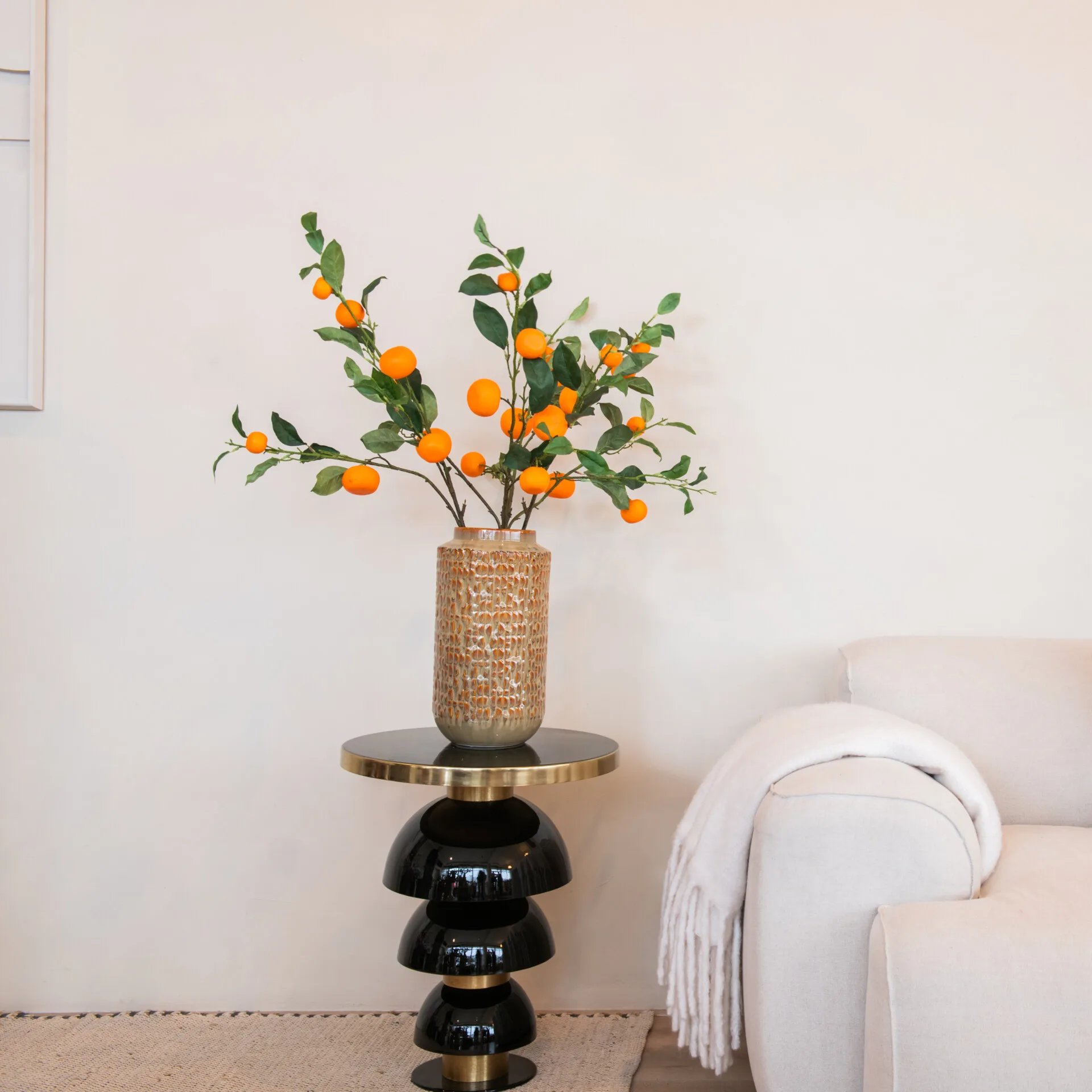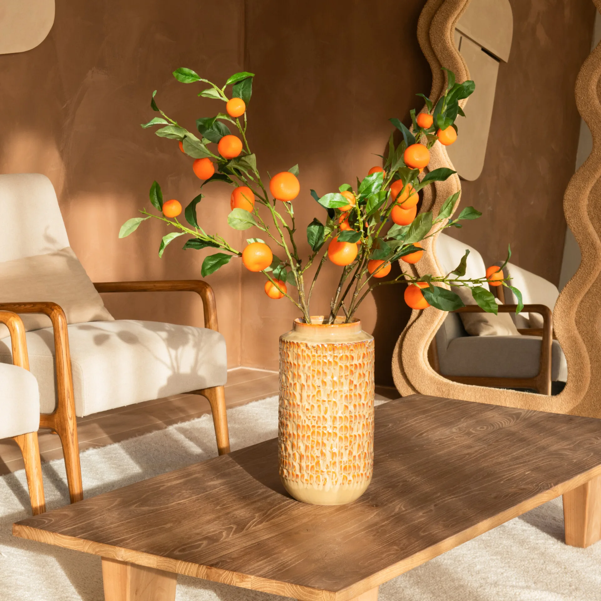 Bloemstuk Liv straalt pure natuur uit met zijn warme aardetinten en organische vormen. De lichtbruine vaas vormt een perfecte basis voor de sierlijke mandarijnen takken, die met hun oranje vruchten een speelse en exotische uitstraling geven. Het groene blad zorgt voor een mooi contrast en een levendige, natuurlijke sfeer. Dit bloemstuk is niet alleen een blikvanger in huis, maar past ook perfect in een restaurant, hotellobby of kantoor. Een stijlvol en tijdloos ontwerp met een vleugje mediterrane charme!