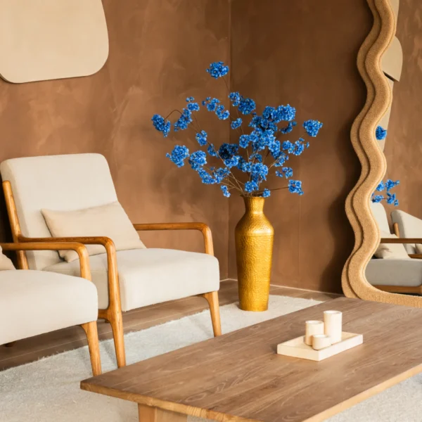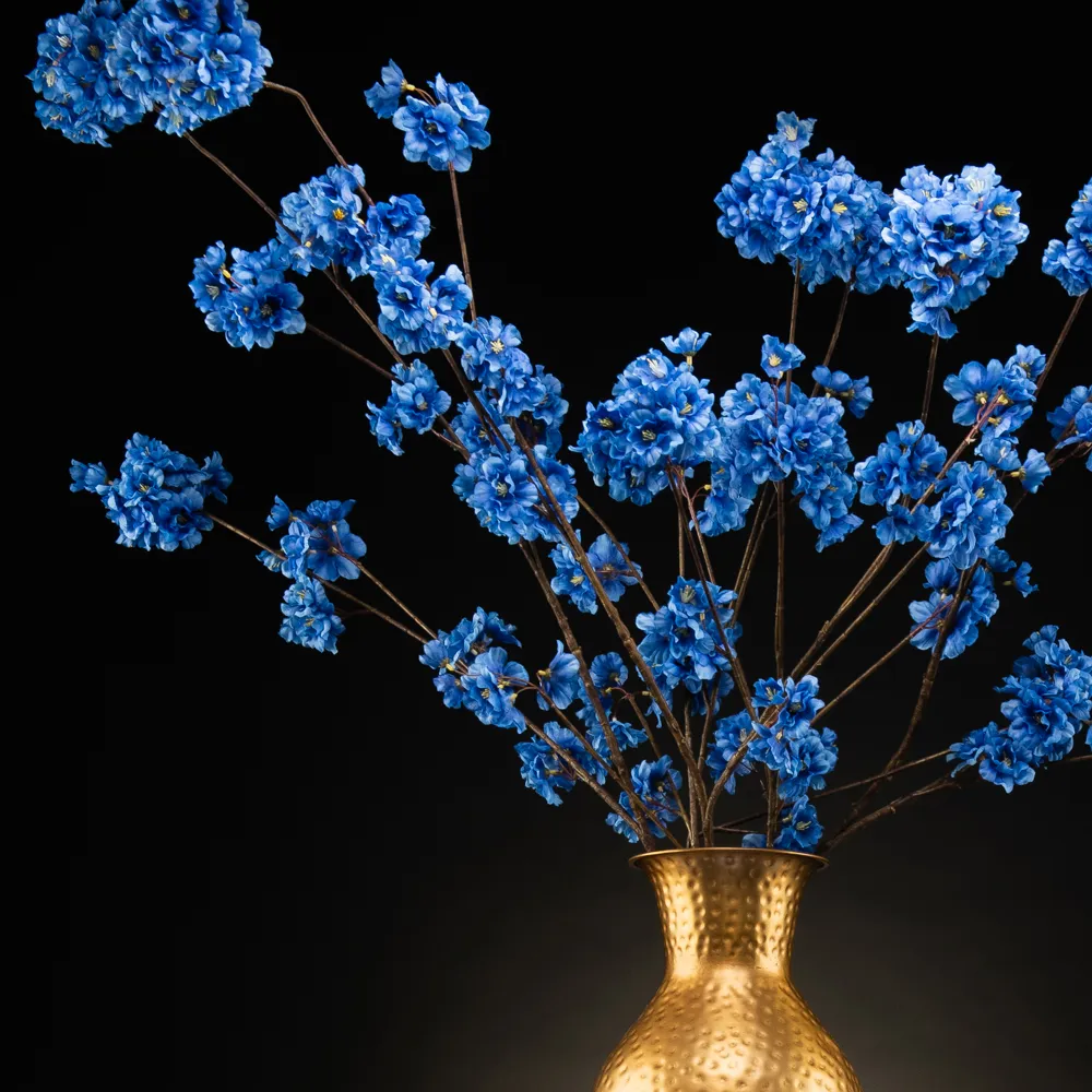Bloemstuk Juul is een echte blikvanger. De diepblauwe bloesemtakken contrasteren prachtig met de luxe, goudkleurige vaas met een verfijnde hamerslagtextuur. Een stijlvolle en onderhoudsvrije decoratie die elegantie en karakter toevoegt aan elk interieur, van modern tot klassiek. Perfect voor wie een uniek en sfeervol accent in huis wil.