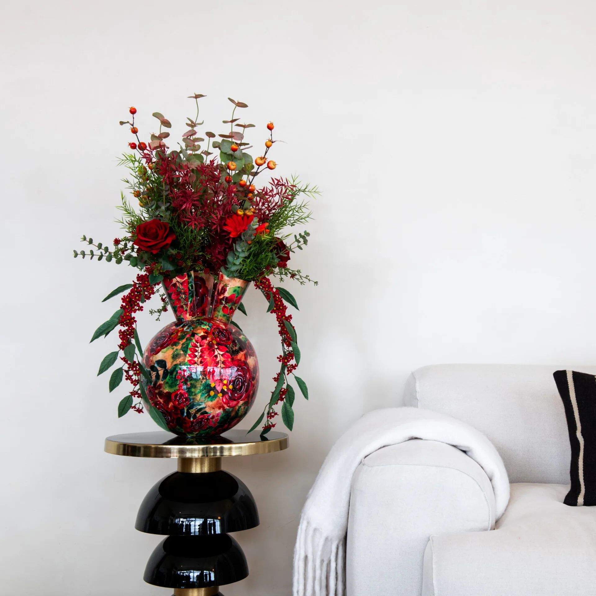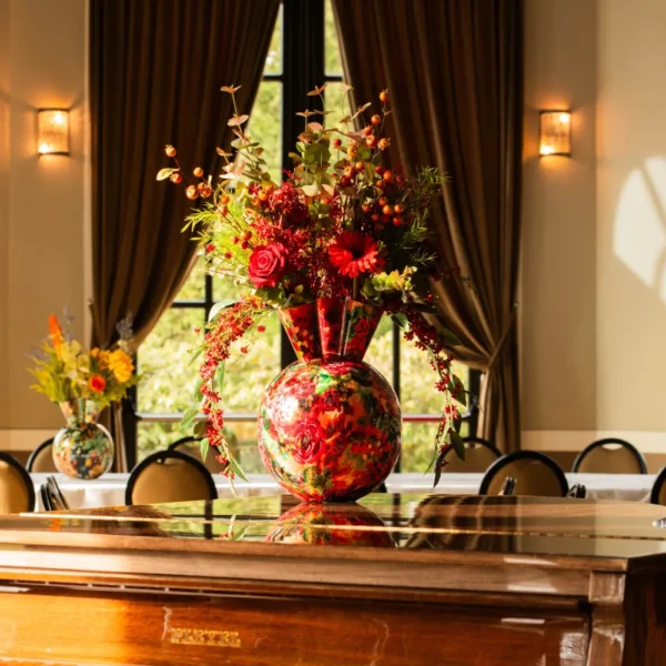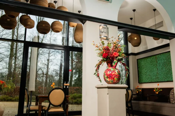 Bloemstuk Liv is een krachtig en expressief arrangement dat direct de aandacht trekt. De diepe rode tinten, gecombineerd met speelse oranje accenten en weelderig groen, geven het een warme en luxe uitstraling. De opvallende vaas met een artistiek bloemenpatroon versterkt de levendige en romantische sfeer. Dit boeket past perfect in een stijlvolle lobby, een elegante hotellounge of een sfeervolle ontvangstruimte waar het een vleugje passie en klasse toevoegt.