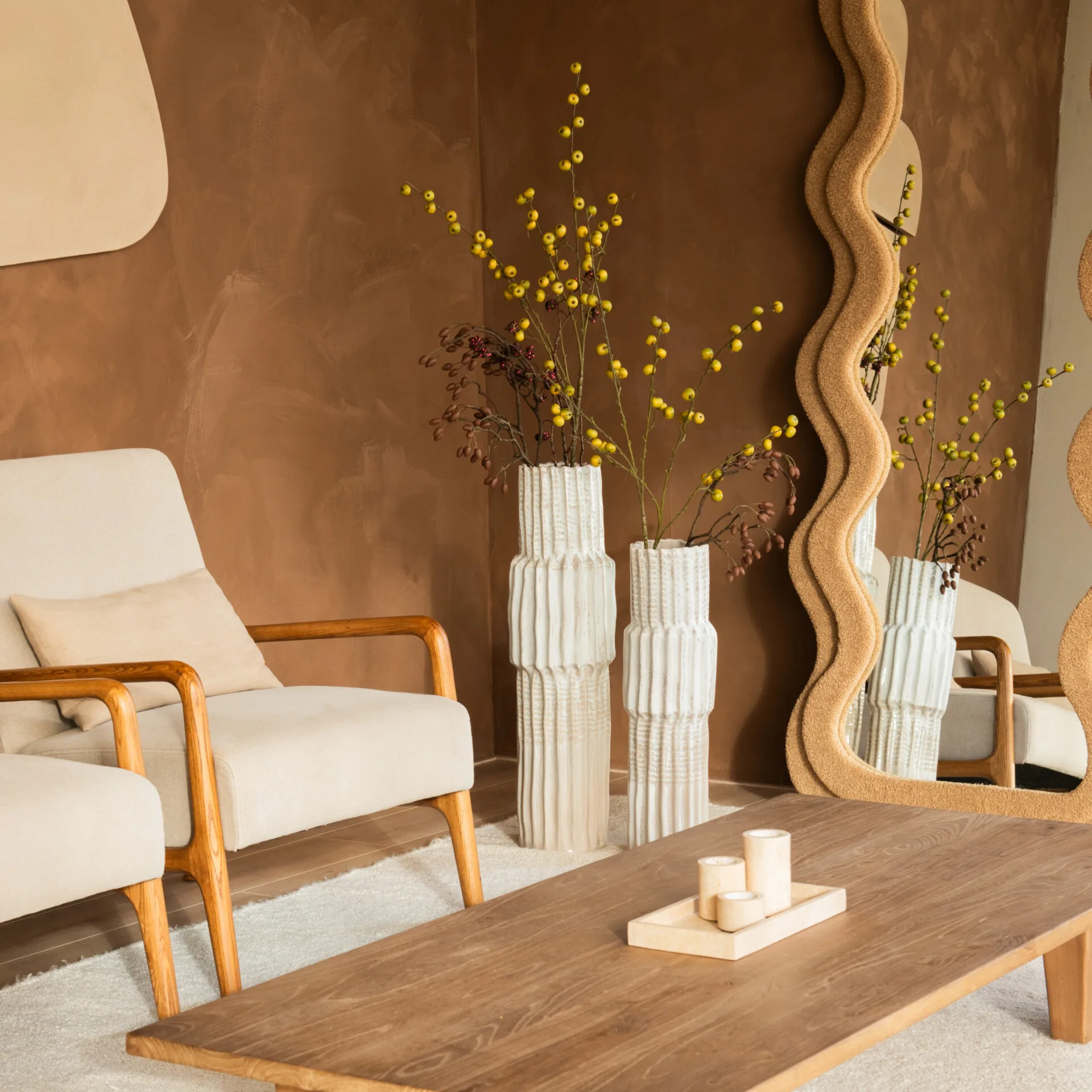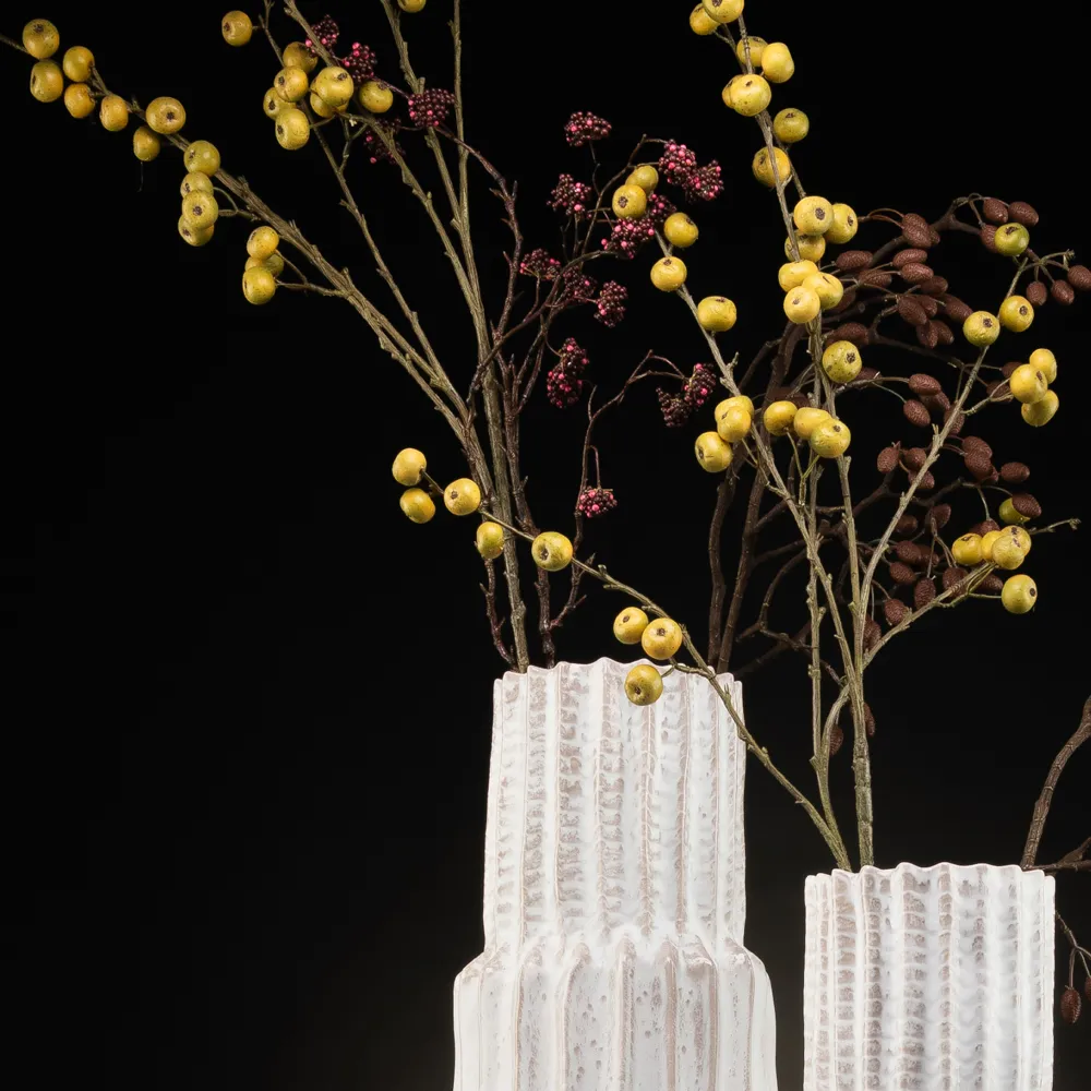 Bloemstuk Lorèn is een stijlvolle set die minimalisme en verfijning uitstraalt. De twee hoge, geribbelde vazen in zachte aardetinten geven een modern karakter, terwijl de sierlijke takken met gele en bordeauxrode bessen een subtiel speels effect toevoegen. Deze set is een elegant statement in elk interieur.