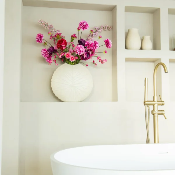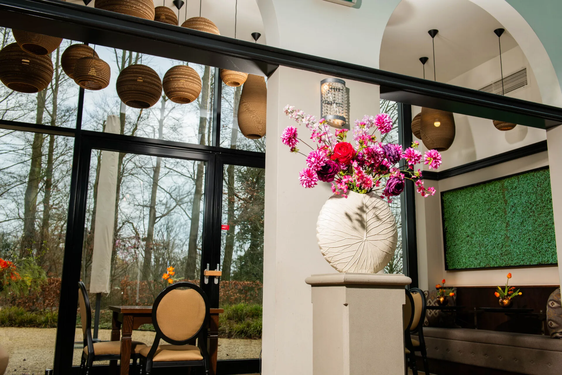 Bloemstuk Lotte is een levendige blikvanger die elke ruimte opfleurt. De kleurrijke mix van roze en paarse bloemen geeft het arrangement een speelse en vrolijke uitstraling. In combinatie met de strakke, witte vaas met subtiele bladstructuur brengt Lotte een frisse en moderne sfeer in huis. Dit bloemstuk is niet alleen een prachtige toevoeging aan het interieur, maar past ook perfect in ontvangsthallen, bedrijfspanden en horecagelegenheden. Lotte zorgt voor een warme en gastvrije ambiance.