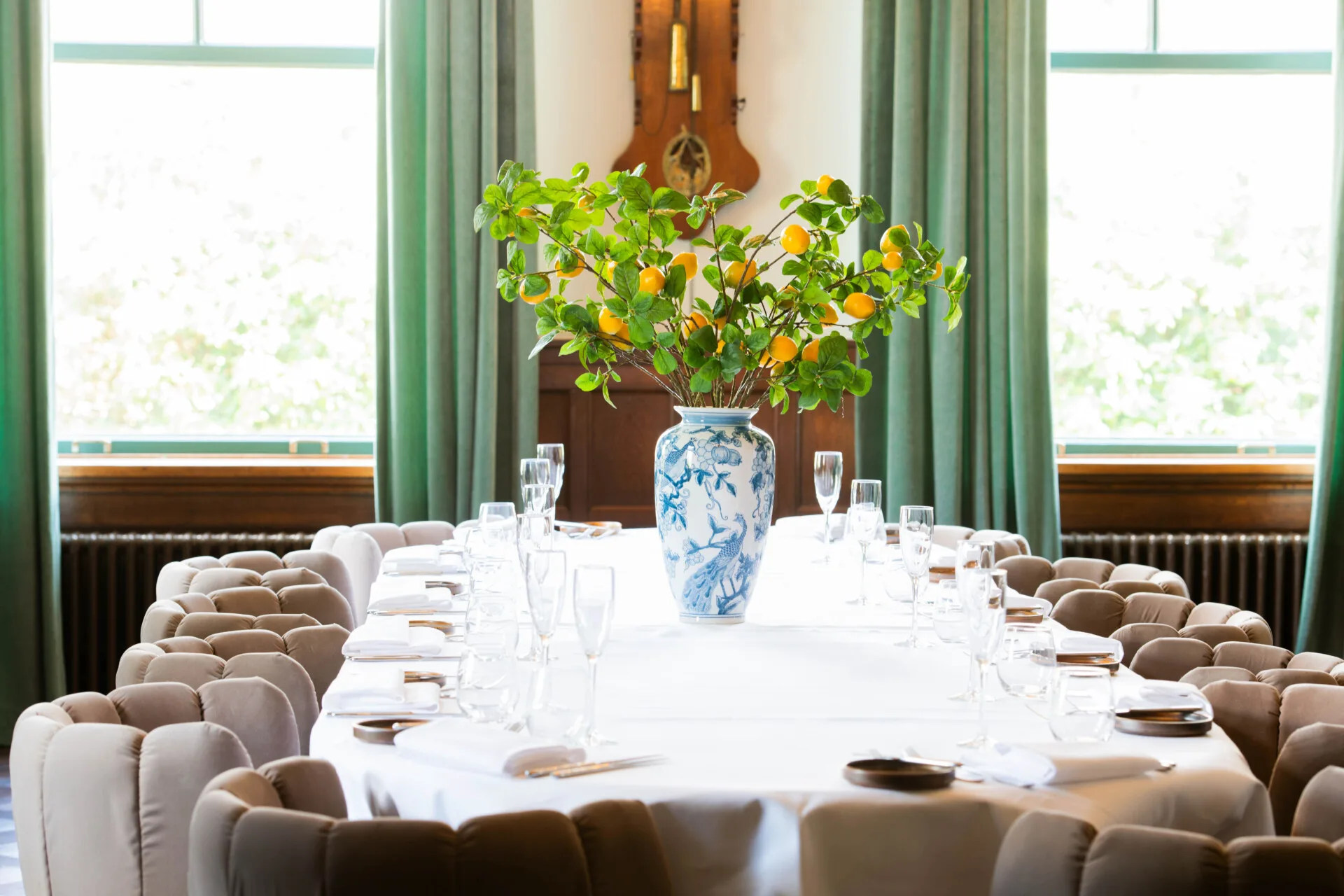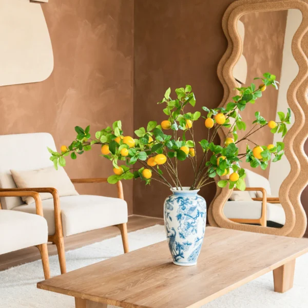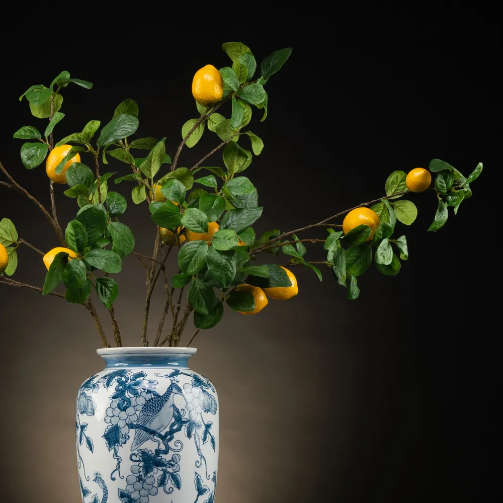 Bloemstuk Luce is een verfrissend en elegant statementstuk. De levendige citroentakken contrasteren prachtig met de klassieke blauw-witte vaas, wat zorgt voor een tijdloze en mediterrane uitstraling.