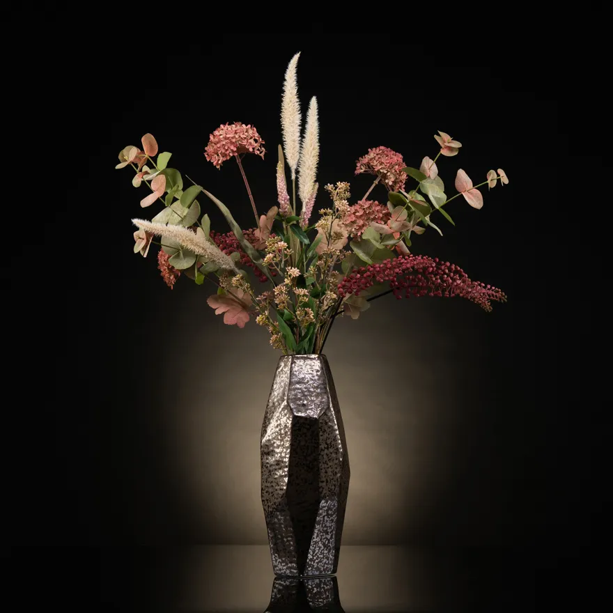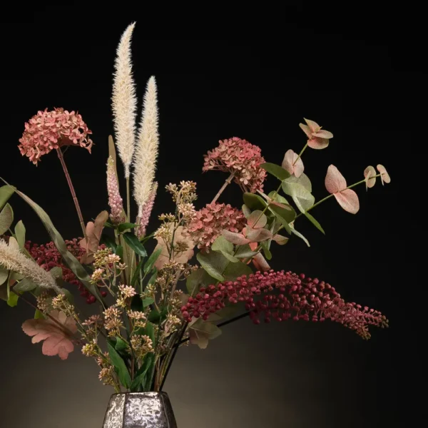 Bloemstuk Mila combineert warme, natuurlijke tinten met een moderne, luxe uitstraling. De mix van deze kunstbloemen en sierlijke pluimen wordt gepresenteerd in een geometrische, metallic vaas, wat zorgt voor een elegante en tijdloze look. Perfect als blikvanger in elk interieur, van klassiek tot modern. Een subtiele touch van verfijning!