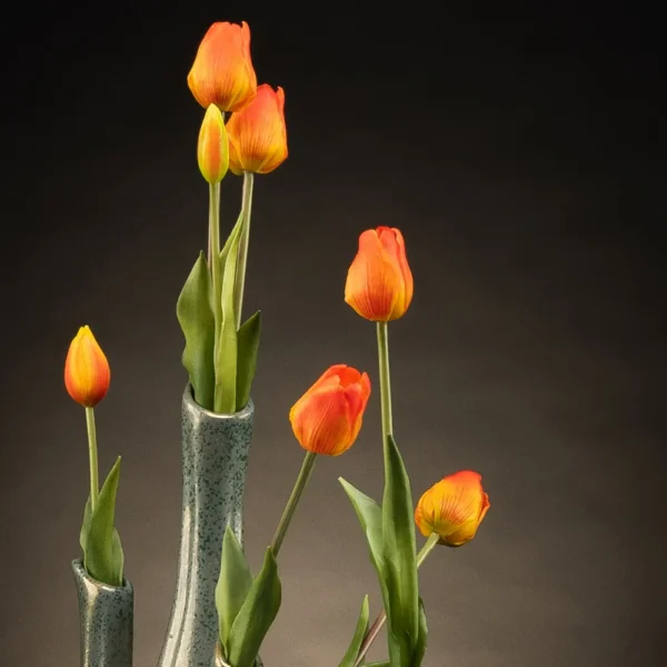 Bloemstuk Noor heeft een speelse en kunstzinnige uitstraling. De levendige oranje tulpen steken sierlijk uit de bijzondere keramieken vazen. Dit unieke arrangement combineert natuurlijke elegantie met een moderne twist en brengt een vleugje warmte in elk interieur.