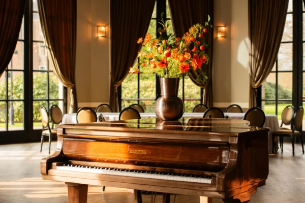 Bloemstuk Orange is een levendige eyecatcher die warmte en energie in je interieur brengt. De combinatie van rijke oranje tinten en frisgroene bladeren zorgt voor een speelse, maar toch stijlvolle uitstraling. Geplaatst in een elegante, donkerbruine vaas, straalt het arrangement luxe en gezelligheid uit. Dit bloemstuk past perfect in een sfeervolle woonkamer, een stijlvolle hotellobby of een uitnodigende entreehal. Met zijn zonnige kleuraccenten en natuurlijke vormen brengt het een vleugje vrolijkheid in elke ruimte!