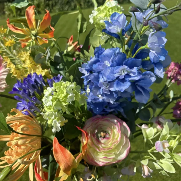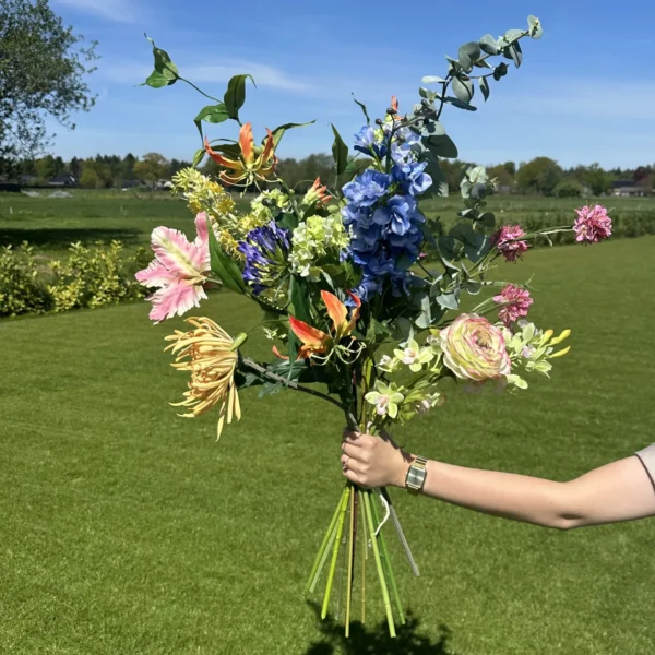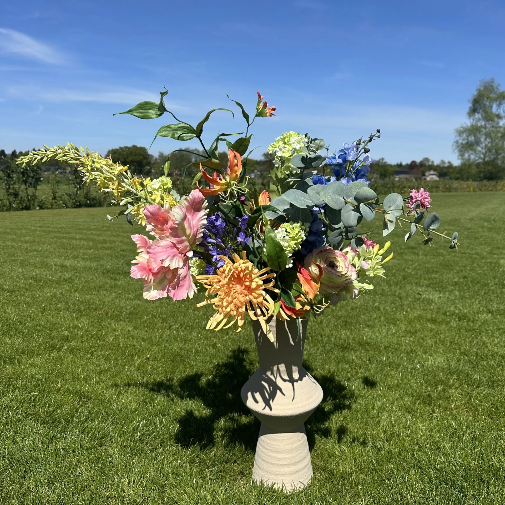 Een kleurrijk boeket vol zomerse bloemen, stijlvol gepresenteerd in een beige vaas. Fris, vrolijk en met zorg samengesteld om elke ruimte op te fleuren – van woonkamers tot kantoren, showrooms en meer. Een echte blikvanger, waar je ‘m ook neerzet!