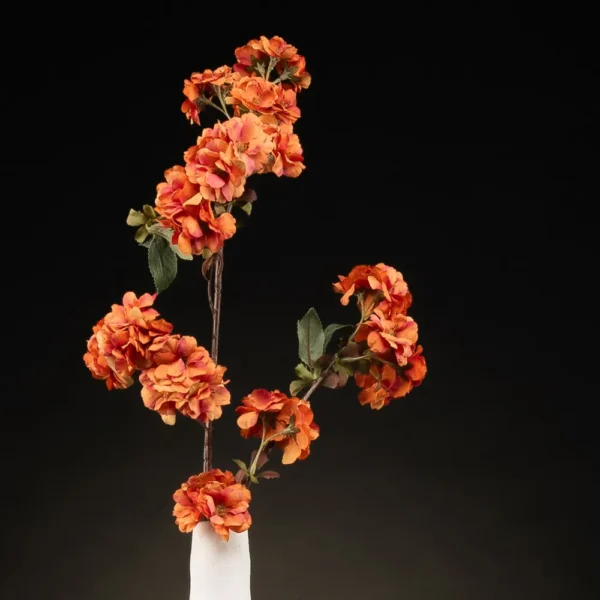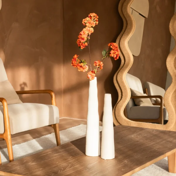 Bloemstuk Saar combineert minimalisme met elegantie. De slanke, wit keramische vazen creëren een stijlvol contrast met de warme oranje bloemen, die speels naar boven rijzen. Dit verfijnde arrangement brengt een subtiele, moderne touch in je interieur.