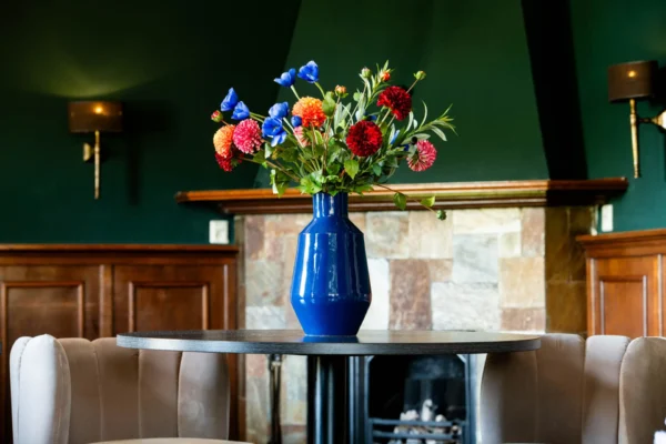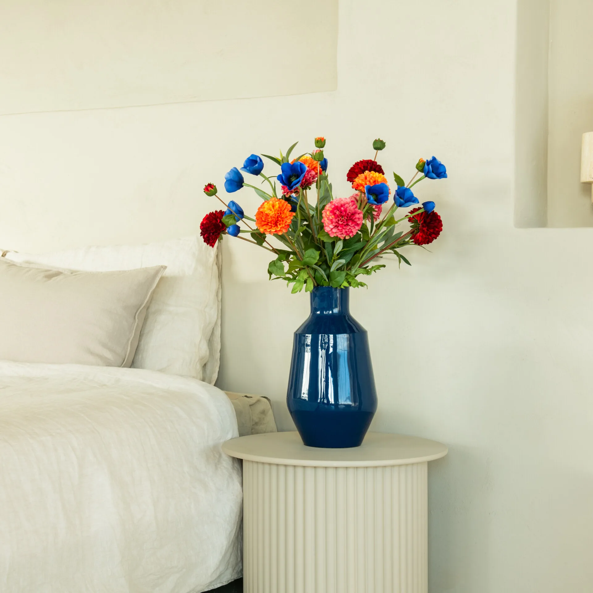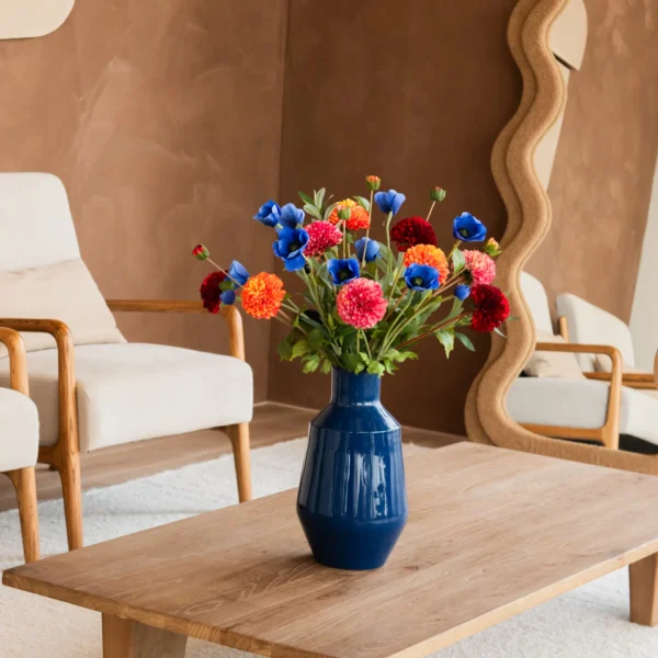 Bloemstuk Yara straalt een levendige en speelse energie uit. De kunstbloemen in felle tinten roze, rood, oranje en blauw zorgen voor een dynamisch kleurenspel dat direct de aandacht trekt. De diepe, glanzend blauwe vaas vormt een stijlvol contrast met de warme tinten van de bloemen en geeft het geheel een moderne en luxueuze uitstraling. Dit bloemstuk is perfect als blikvanger in een interieur, waar het een frisse en energieke sfeer toevoegt.
