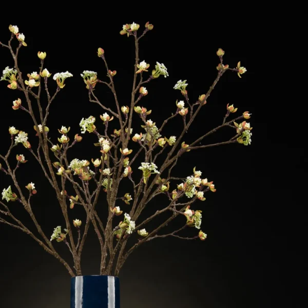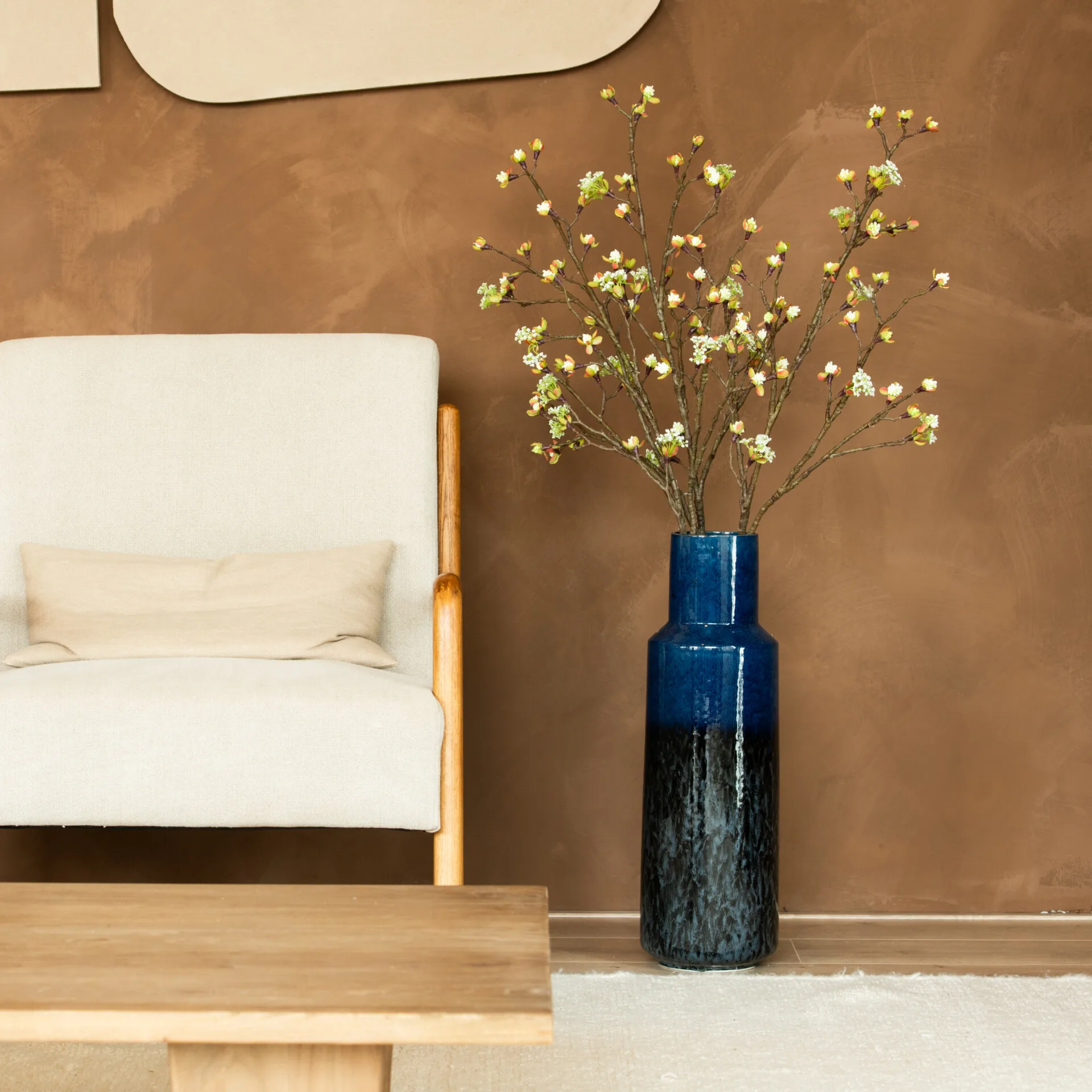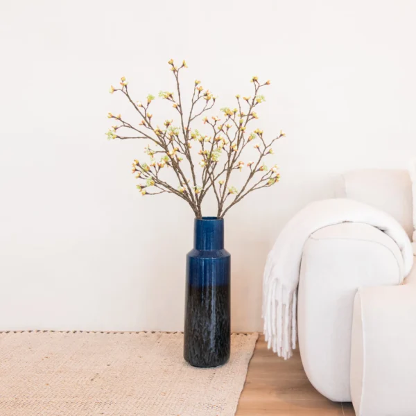 Bloemstuk Zélie is een bloemstuk met een elegante uitstraling. De diepe blauwtinten van de slanke vaas vormen een prachtig contrast met de takken vol kleine bloesems. Dit arrangement straalt rust en klasse uit, perfect voor een modern interieur met een artistieke touch.