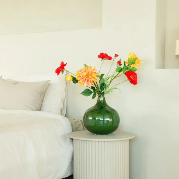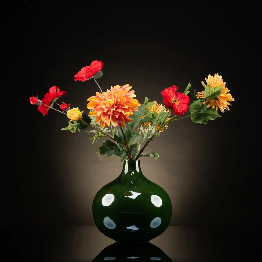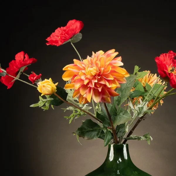 Bloemstuk Zoë straalt warmte en energie uit. De combinatie van vurige rode en zonnig oranje bloemen zorgt voor een speelse, dynamische uitstraling. De diepe groene bolvormige vaas geeft het geheel een luxe en moderne touch. Een prachtige, onderhoudsvrije toevoeging aan elk interieur die direct sfeer en kleur brengt.