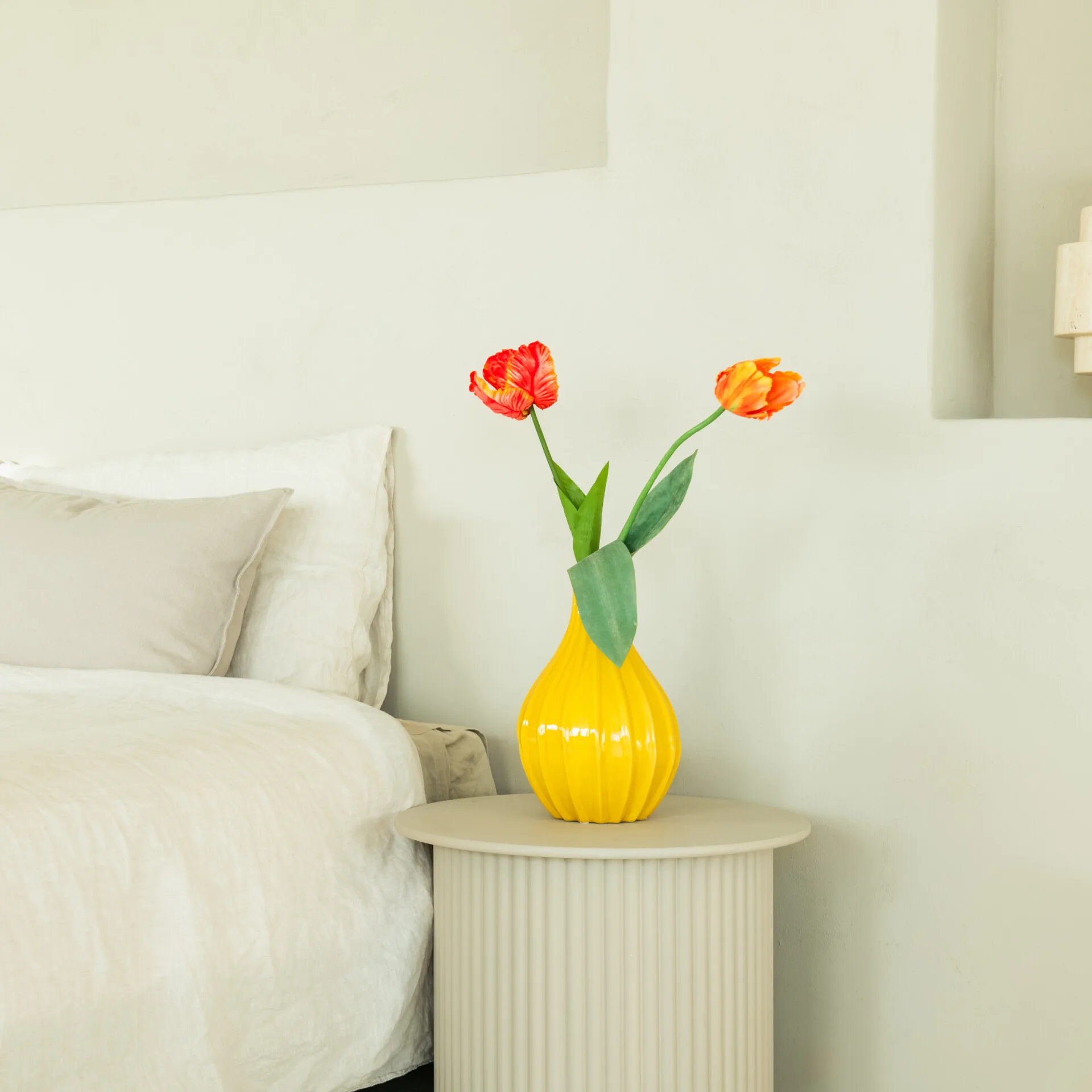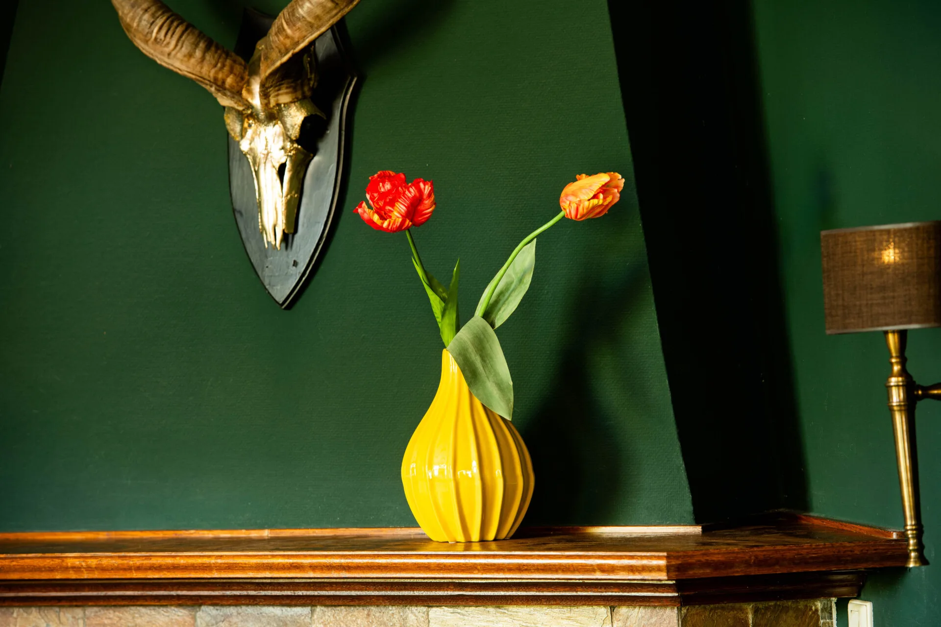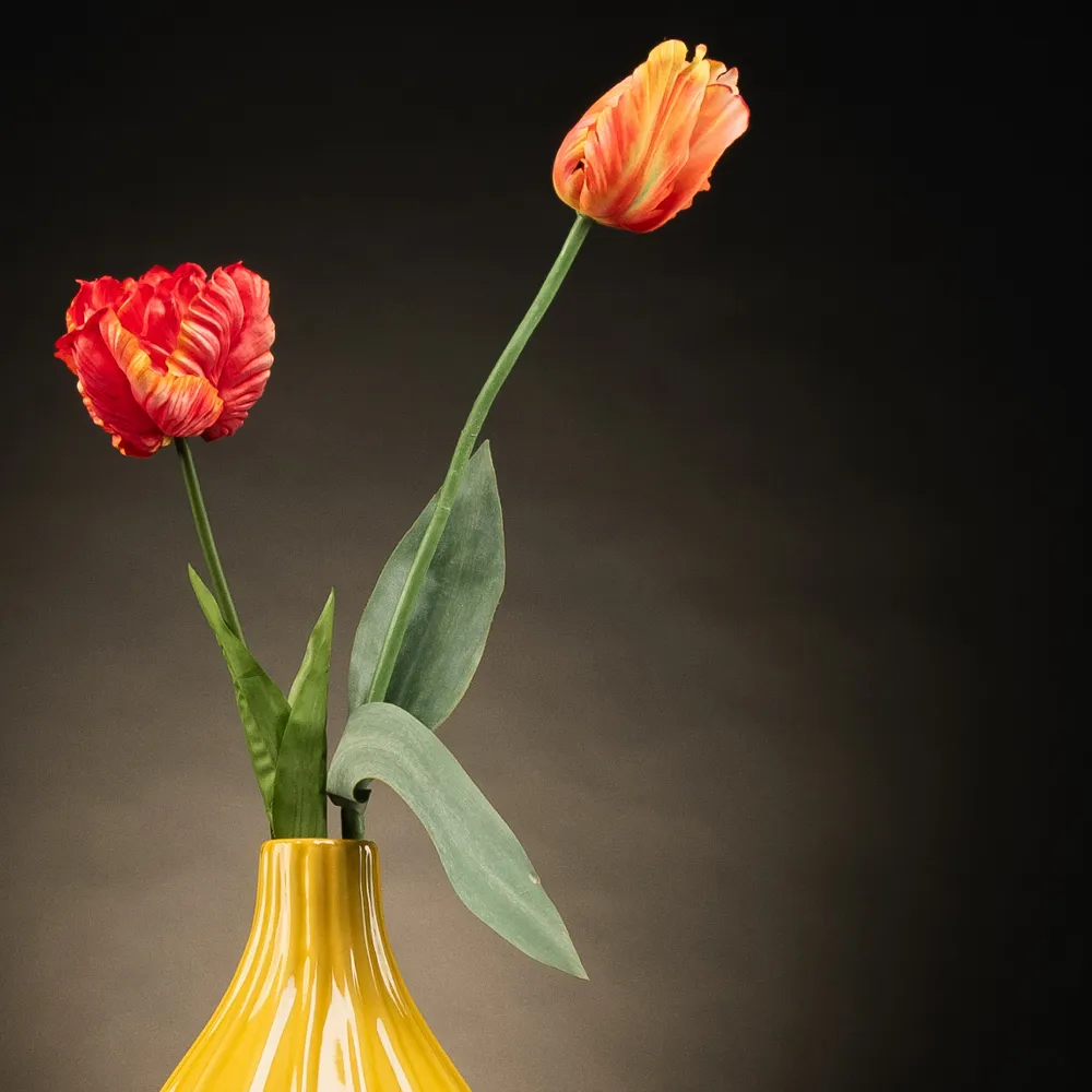Bloemstuk Feline straalt speelsheid en elegantie uit. De twee levendige tulpen in rood en oranje contrasteren prachtig met de glanzende, gele vaas. De asymmetrische plaatsing creëert een dynamisch en kunstzinnig effect. Een subtiele, maar krachtige eyecatcher die elke ruimte opfleurt!