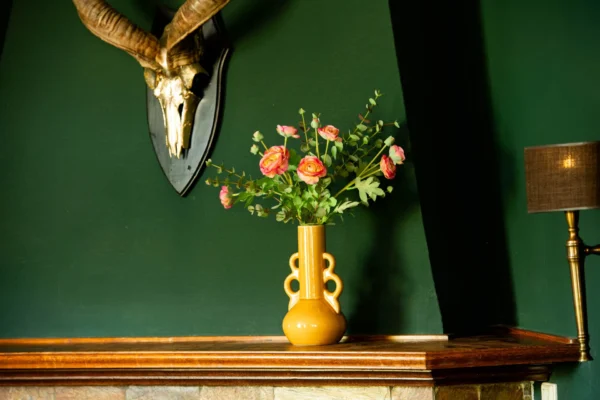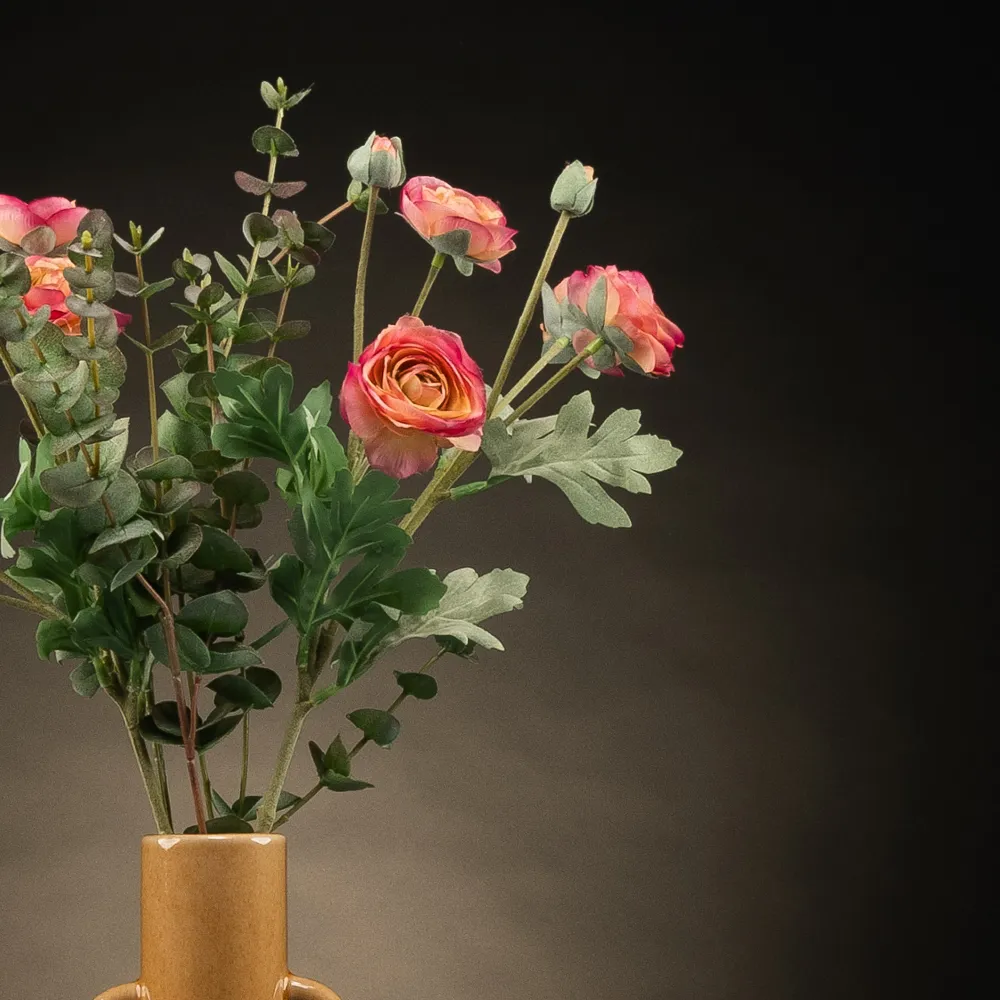 Bloemstuk Giulia heeft een speelse en stijlvolle uitstraling. De roze-oranje bloemen in combinatie met groene takken zorgen voor een frisse, natuurlijke look. Geplaatst in een karaktervolle vaas met unieke handvatten, vormt dit een sfeervolle decoratie die een warme en charmante touch aan elk interieur geeft.